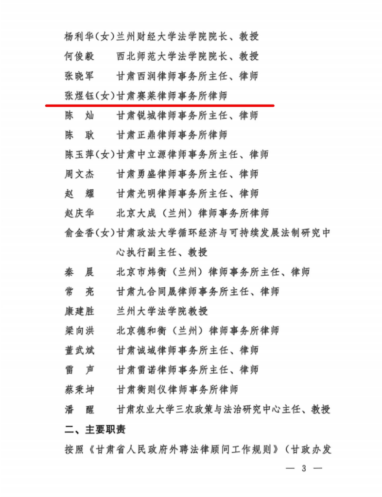 为全面推进法治政府建设,进一步提高政府依法行政、依法决策水平,近日,甘肃省人民政府办公厅印发《关于聘任省政府第四届外聘法律顾问的通知》(甘政办发【2026】3号),甘肃赛莱律师事务所张煜钰律师凭借扎实的专业功底、丰富的实务经验和良好的职业声誉,成功入选并获聘为甘肃省人民政府第四届外聘法律顾问,聘期3年。