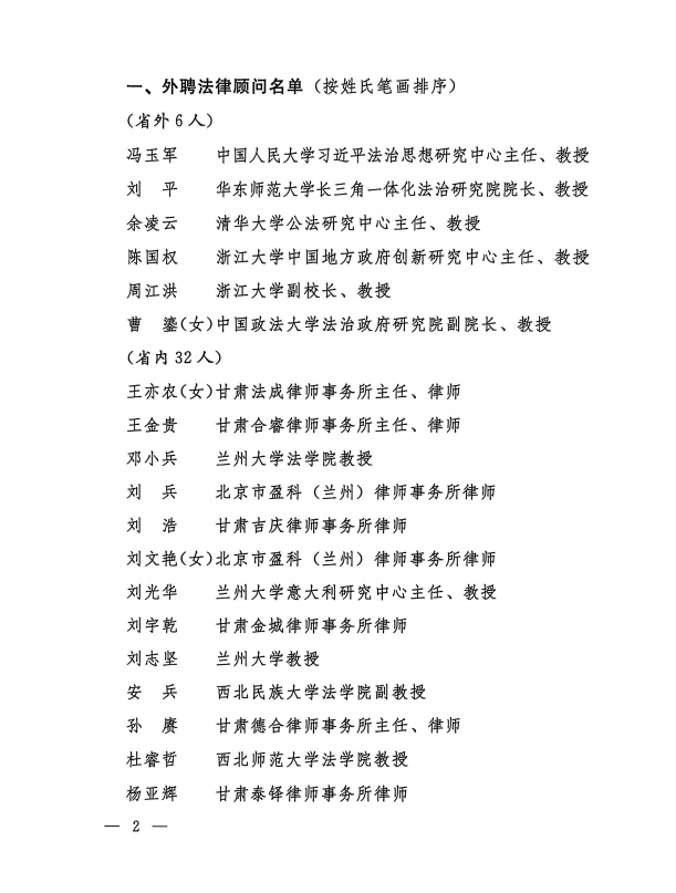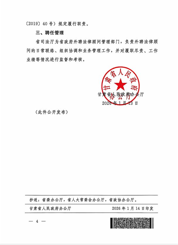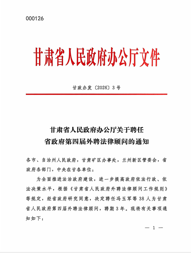 为全面推进法治政府建设,进一步提高政府依法行政、依法决策水平,近日,甘肃省人民政府办公厅印发《关于聘任省政府第四届外聘法律顾问的通知》(甘政办发【2026】3号),甘肃赛莱律师事务所张煜钰律师凭借扎实的专业功底、丰富的实务经验和良好的职业声誉,成功入选并获聘为甘肃省人民政府第四届外聘法律顾问,聘期3年。
