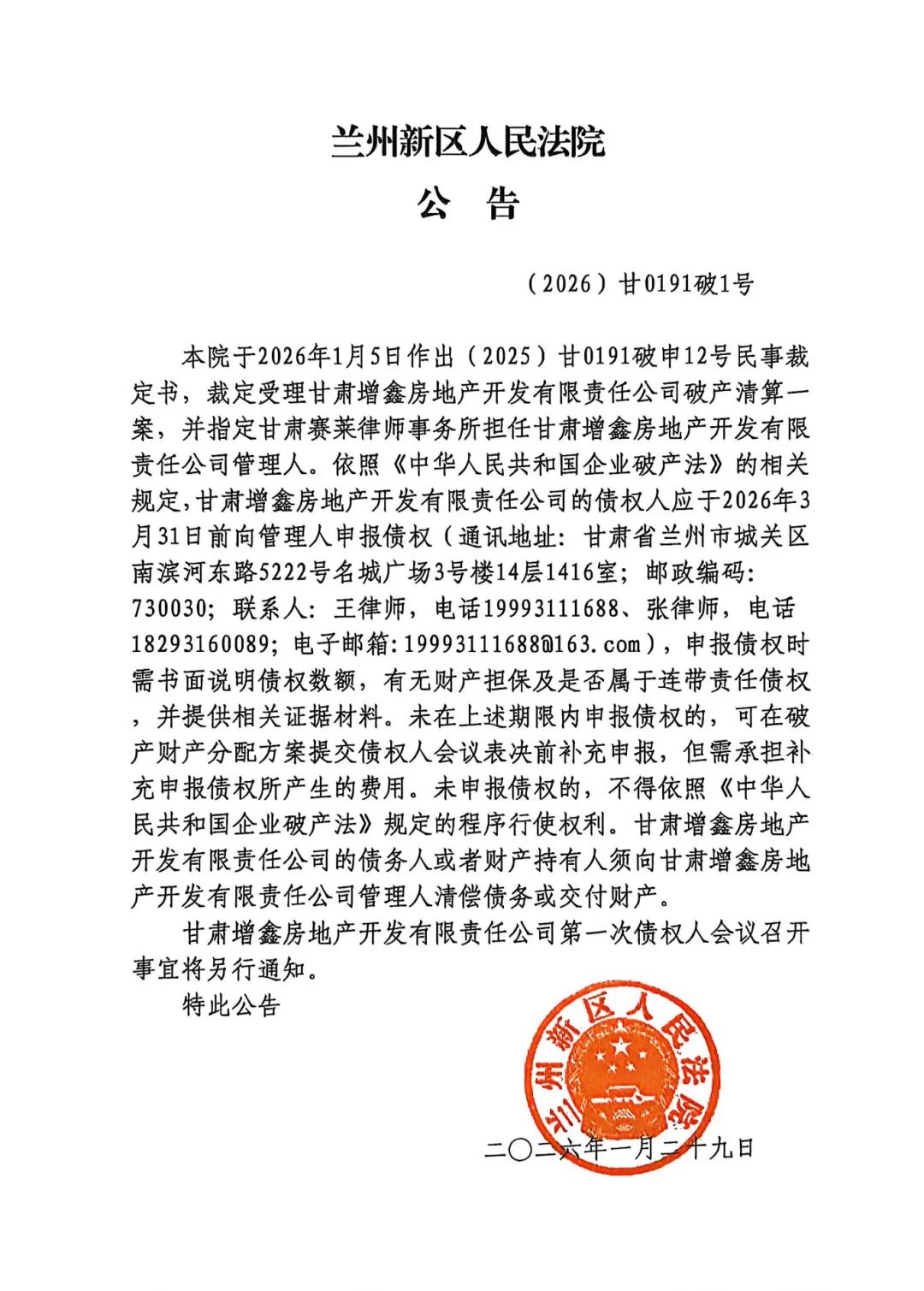 兰州新区人民法院于2026年1月5日作出(2025)甘0191破申12号民事裁定书,裁定受理甘肃增鑫房地产开发有限责任公司破产清算一案,并于2026年1月23日指定甘肃赛莱律师事务所担任甘肃增鑫房地产开发有限责任公司的管理人。今日,兰州新区人民法院发布了申报债权的公告,甘肃增鑫房地产开发有限责任公司的债权人应于2026年3月31日前向管理人申报债权,公告具体如下: